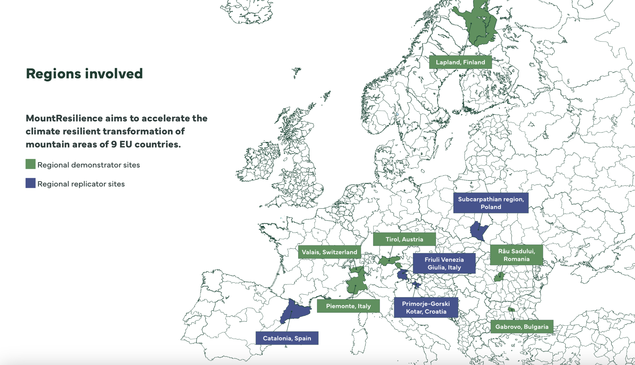 MountResilience involves the participation of 6 mountainous and polar regions across Europe: Lapland (Finland), Tirol (Austria), Piemonte (Italy), Râu Sadului (Romania), Gabrovo (Bulgaria) and Valais (Switzerland). Additionally, other 3 regions will be following the project: Catalonia (Spain), Friuli Venezia-Giulia (Italy) and the Subcarpathian region in Poland.